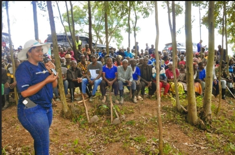 Gitifu w’Umurenge wa Karama, Yvette Aline Nirere aha ikaze Abashyitsi ubwo bari bagiye kuganira n’Abaturage nyuma y’igikorwa cy’Umuganda.