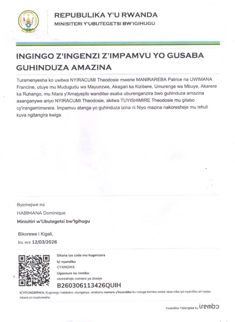 Uwitwa Nyiracumi Theodosie, mwene Manirareba Patrice na Uwimana Francine, utuye mu Mudugudu wa Mayunzwe, Akagari ka Kizibere, Umurenge wa Mbuye, Akarere ka Ruhango, mu Ntara y’Amajyepfo, yanditse asaba uburenganzira bwo guhinduza amazina asanganywe ariyo Nyiracumi Theodosie, akitwa Tuyishimire Theodosie mu gitabo cy’irangamimerere. Impamvu atanga yo guhinduza izina ni uko ari yo mazina yakoresheje mu ishuri kuva agitangira kwiga.