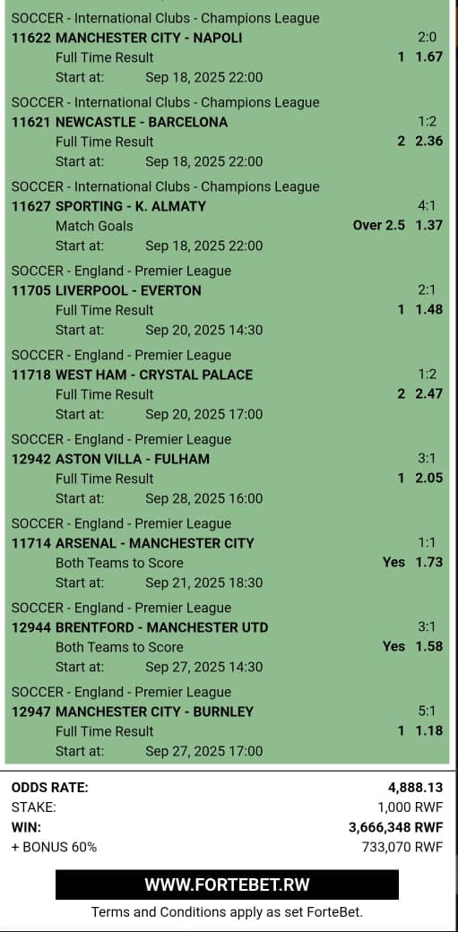 Uyu Munyamahirwe, mu gutega kwe ubwo yakoraga Ipari ye yashyizeho amafaranga Igihumbi (1,000Frws), maze ahitamo imikino 17. Iyo mikino yatangiye tariki 17 Nzeri. Mu gihe andi makipe yose yari yabikoze( uko yabitegeye), byamusabye gutegereza ko hasozwa umukino wahuzaga ikipe ya Manchester City yatsinze Burnley ndetse na Brentford na Manchester United binjizanya igitego.