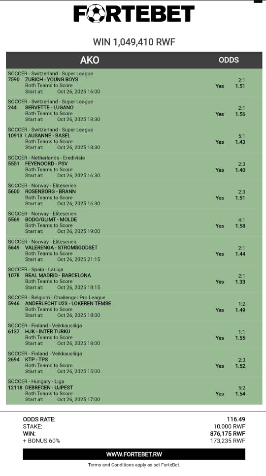 Umunyamahirwe utangaje muri FORTEBET yakoze Ipari imwe inshuro ebyiri atsindira akayabo ka 1,049,410Frws. Kugira ngo agere ku ntsinzi ye y’iki cyumweru, uyu munyamahirwe yasabwaga gukora ibintu bike cyane ari byo gutega (betting) itike ye inshuro ebyiri kugira ngo atsinde ubugira kabiri.