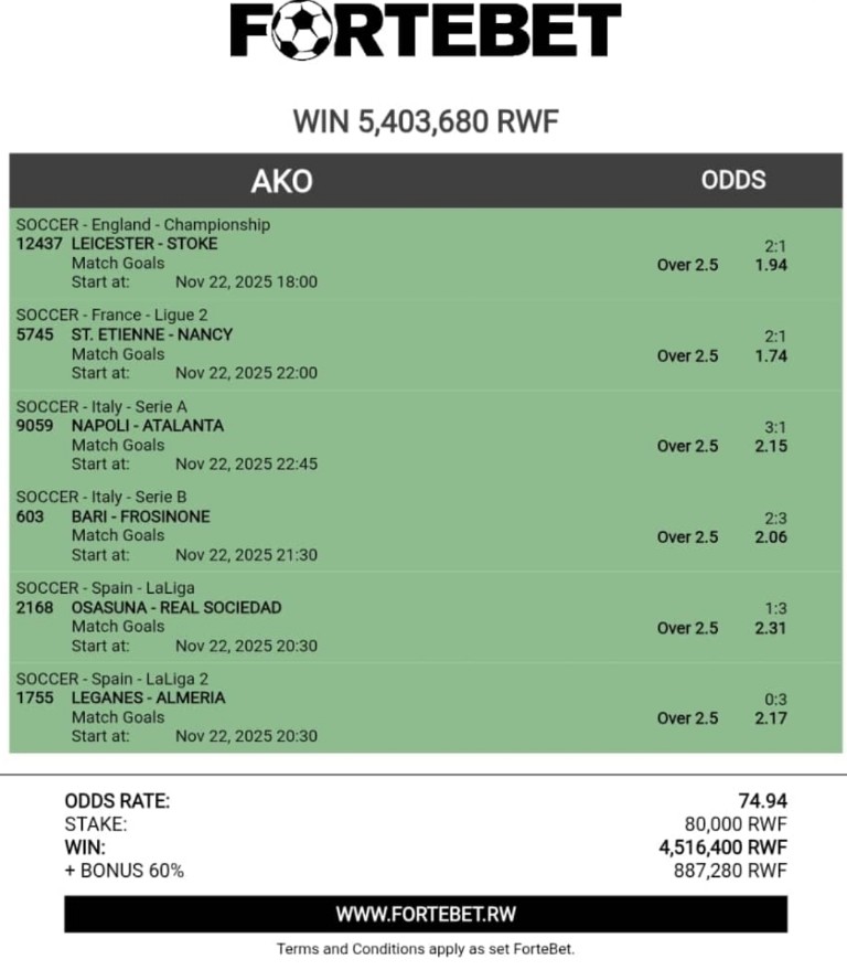 Over za 2.5 zahesheje Umunyamahirwe muri FORTEBET gutsindira akayabo ka 5,403,680Frws