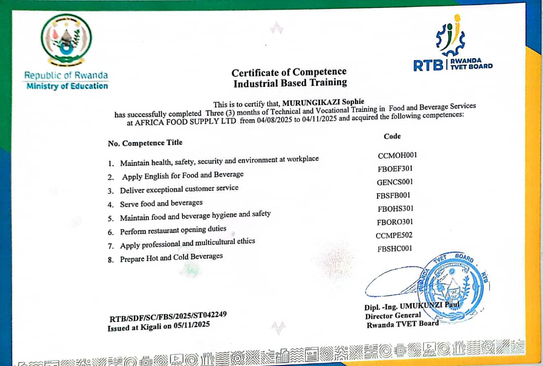 Abanyeshuri 20 kuri uyu wa 30 Ukuboza 2025 bashyikirijwe Impamyabushobozi(Certificate). Ni nyuma yo gusoza amasomo ajyanye n’Ubumenyingiro batangiye Tariki 04 Kanama 2025 agasozwa tariki 04 Ugushyingo 2025 muri AFRICA FOOD SUPPLY Ltd. Mu masomo bize harimo; Ibijyanye no Guteka, Gutegura neza Ibiribwa n’Ibinyobwa, Gutegura Kawa(Barista), Kwakira Abakiriya n’ibindi. Muri 20 basoje Amasomo, 10 bangana na ½ cy’abayasoje bahise bizezwa akazi ariko n’abandi bizezwa ko batari bonyine, ko bazakomeza guherekezwa. Babwiwe ko muri AFRICA FOOD SUPPLY Ldt ari mu rugo, basabwa kuba intangarugero aho bagenda hose. Ni amasomo yatanzwe ku bufatanye na Minisiteri y’Uburezi/ Mineduc binyuze muri Rwanda TVET Board(RTB).